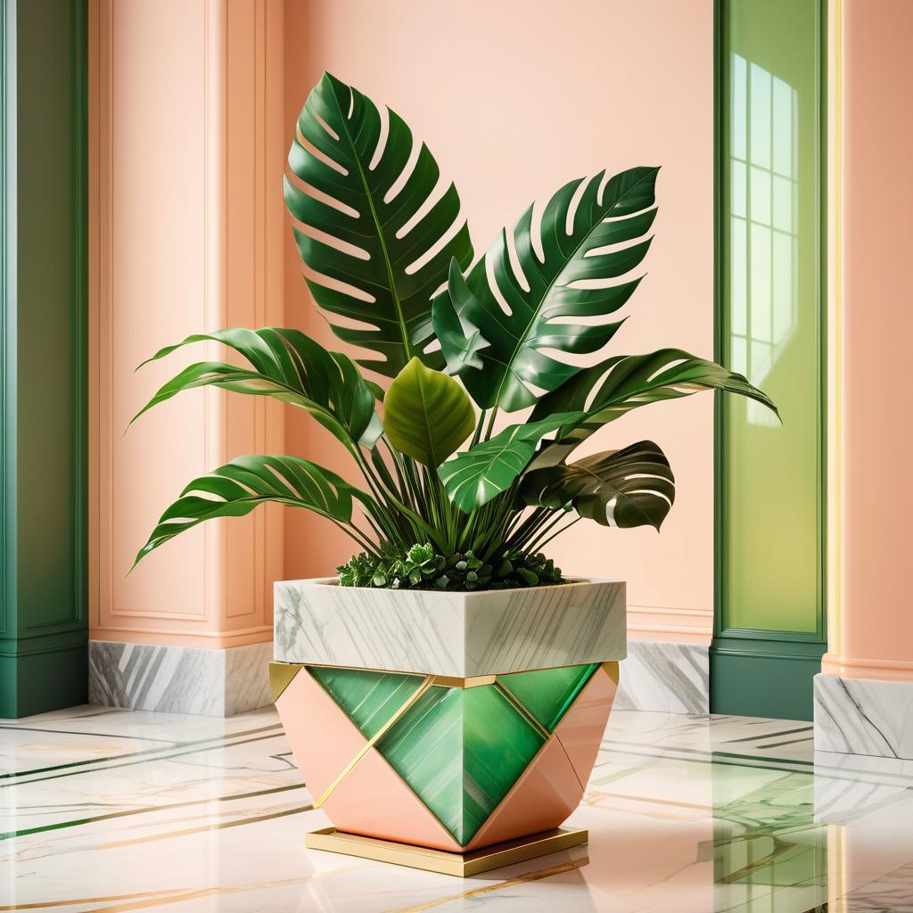Interior scene showcasing a contemporary planter featuring geometric shapes with marble texture and green glass panels. The planter contains lush green tropical leaves, set against pastel peach and green walls with classic architectural paneling. Polished marble floor reflects the planter, enhancing the elegant and fresh ambiance of the space.