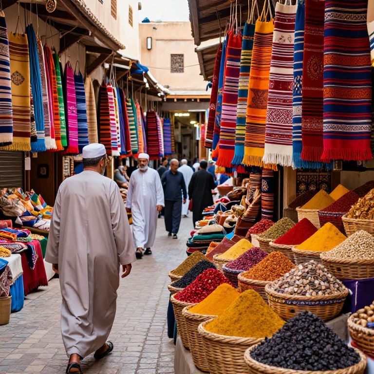 Colorful Moroccan market photo: Traditional men in white robes walk past vibrant, striped textiles and baskets of spices and nuts.