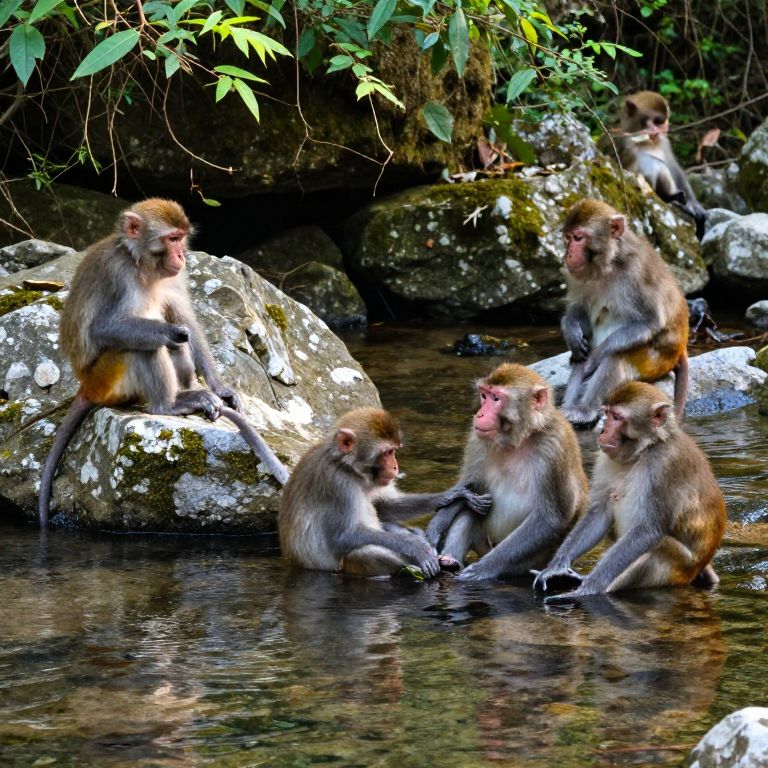 A serene scene of macques lounging by a mountain stream, crystal clear water reflecting their playful interactions, soft afternoon light illuminating the mossy rocks and leafy banks, naturalistic color palette, peaceful and immersive atmosphere