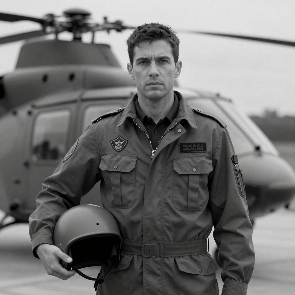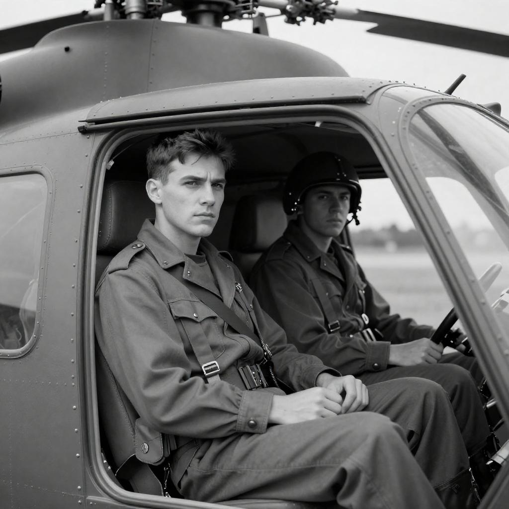 Black-and-white photograph of two men in World War II-era military uniforms sitting inside an open helicopter cockpit. The man on the left, with short dark hair and a serious expression, sits in the front, while the man on the right, with a helmet and focused gaze, sits behind him. The helicopter's rotor blades and cockpit details are visible in the background.