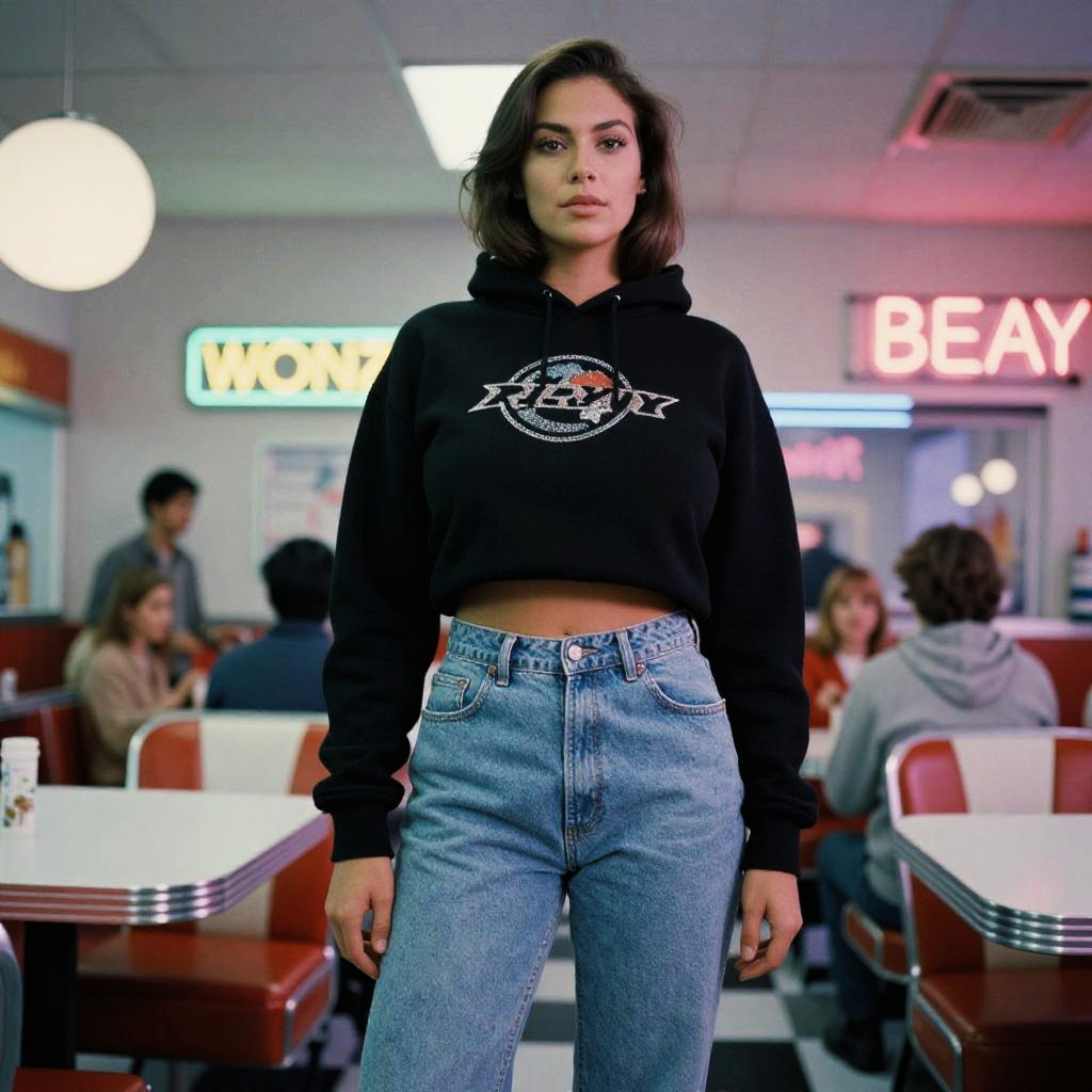 Photograph of a young woman with medium brown skin and dark brown, shoulder-length wavy hair standing in a retro-style diner. She wears a black cropped hoodie with a white graphic, high-waisted blue jeans, and stands with her arms relaxed at her sides. The background shows red and white booths, a white ceiling with fluorescent lights, and neon signs reading "BEAY" and "WORLD". Other patrons, blurred in the background, sit at tables. The overall color palette includes black, blue, red, and white, with a retro, 1950s diner aesthetic.