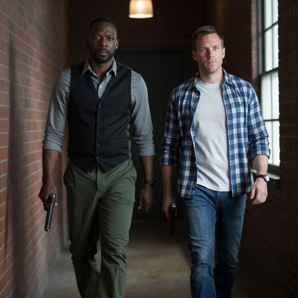 Two Muscular Men at Night with Intense Expressions