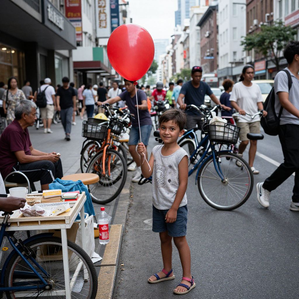 Children photo prompts: A child holding a red balloon in a bustling city street, smiling at the camera amidst street vendors and bicycles, dynamic composition, urban background, candid and authentic moment, vibrant contrast, realistic skin tones.