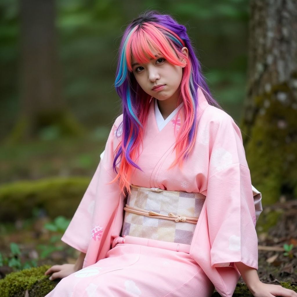Masterpiece, best quality, 1girl, multicolored hair, pink kimono, bit gag, checkered sash, looking at viewer, sitting, in forest, perfect light, hands away