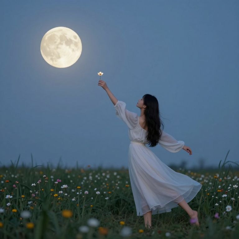 In a field bathed in the ethereal glow of a full moon, a figure reaches toward a delicate flower as if bridging the gap between earth and sky, embodying the tender dance of hope and wonder amidst the transient beauty of nature.