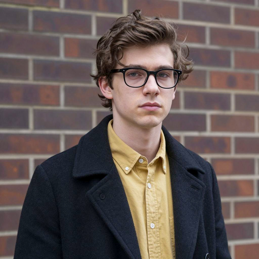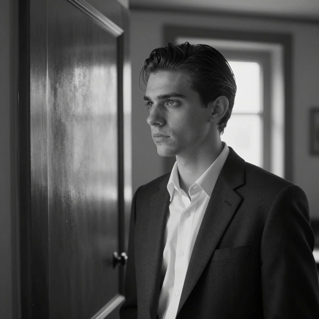Black and white photo of a young man with short, dark, slicked-back hair and a serious expression. He is wearing a dark suit jacket over a white shirt. He stands in front of a reflective door in a dimly lit room. The background includes a window and wooden trim. He looks to the left. The door and window have soft light.