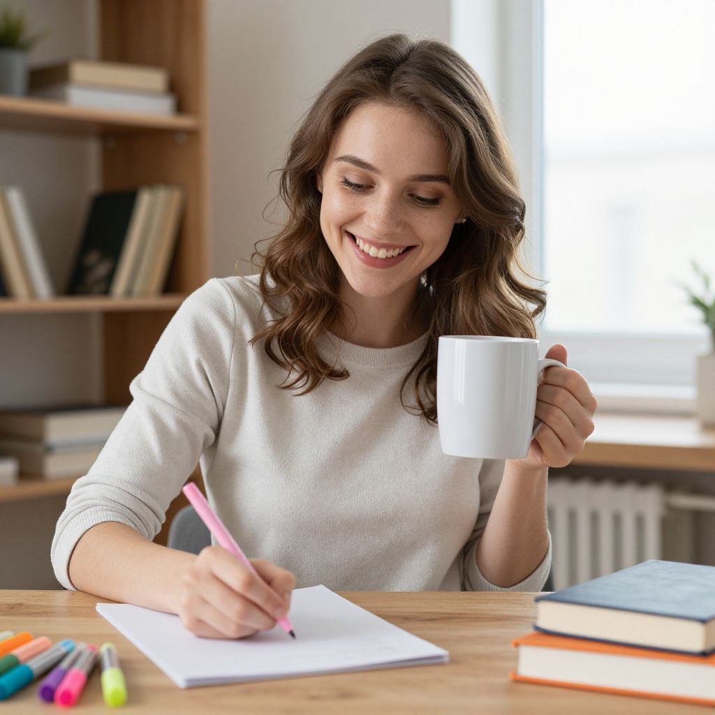 Woman smiling brightly while sitting at a wooden table, holding a white mug in her left hand and writing with a pink pen on a piece of paper in her right hand, surrounded by colorful markers and books, with shelves and a window in the background.