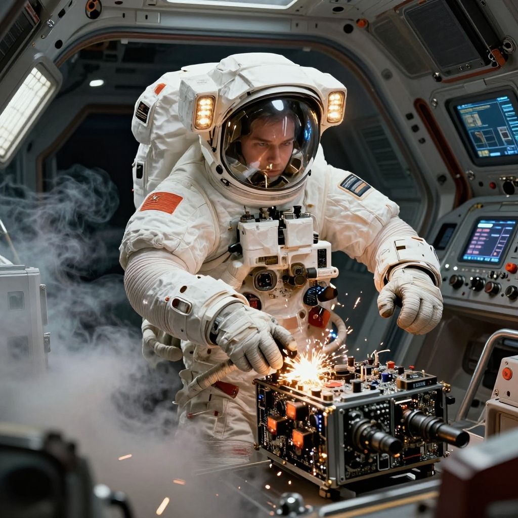 Photorealistic digital art of an astronaut in a white spacesuit, welding equipment with sparks, inside a futuristic spacecraft with control panels and smoke.