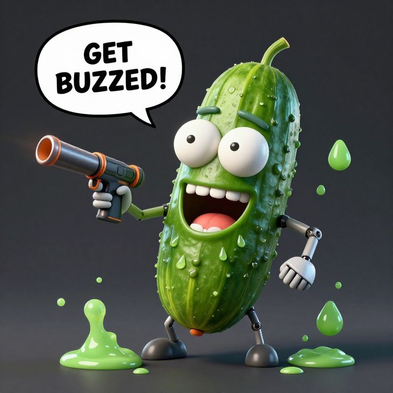 3D, blender style, a cucumber with robotic arms and legs, pickle Rick from Rick and Morty show holding a lazer gun while saying in a speech bubble while laughing like crazy: \"GET BUZZED!\", big realistic eyes, pickle juice dripping all around