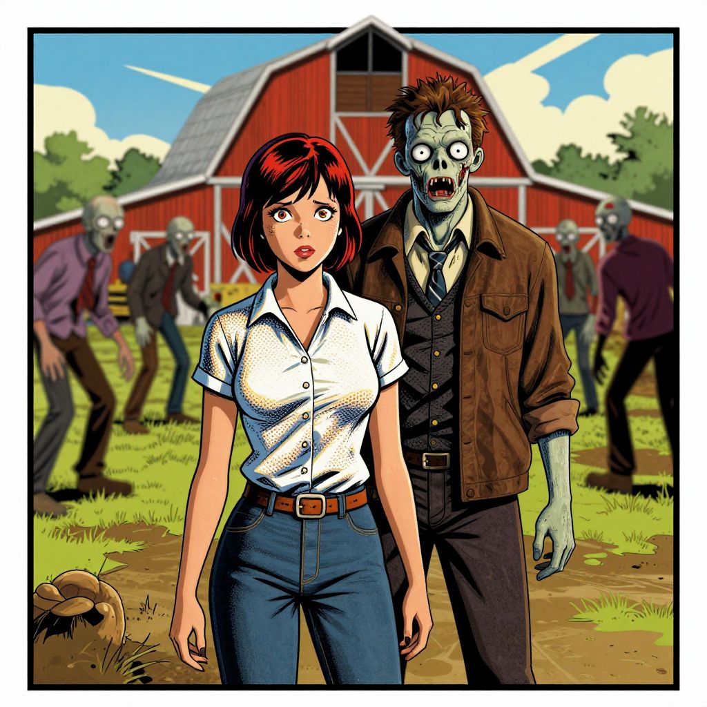Comic-style drawing: Scared woman with red bob haircut, white blouse, blue jeans, stands beside green-skinned zombie in brown jacket, red barn