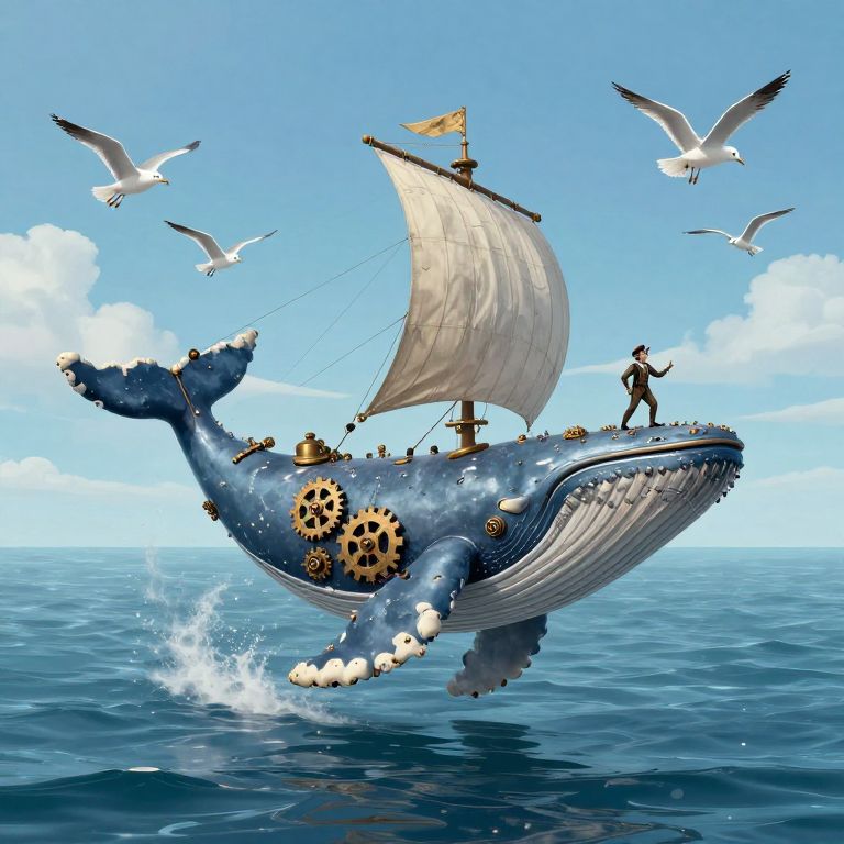 A whimsical odyssey of serenity and wonder unfolds as a steampunk whale, adorned with gears and sails, glides through a boundless sky-ocean, its path guided by a solitary sailor and accompanied by the symphony of synchronized seagulls, evoking a timeless dance between freedom and purpose.