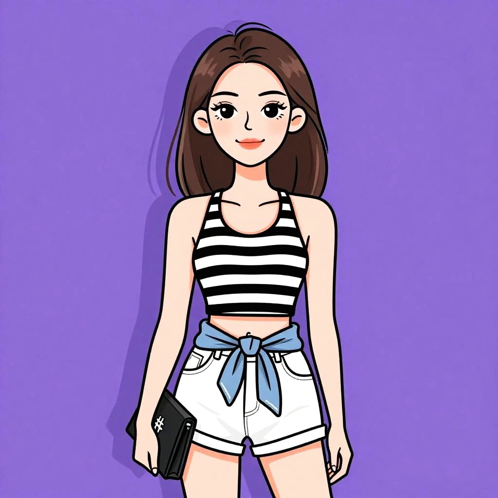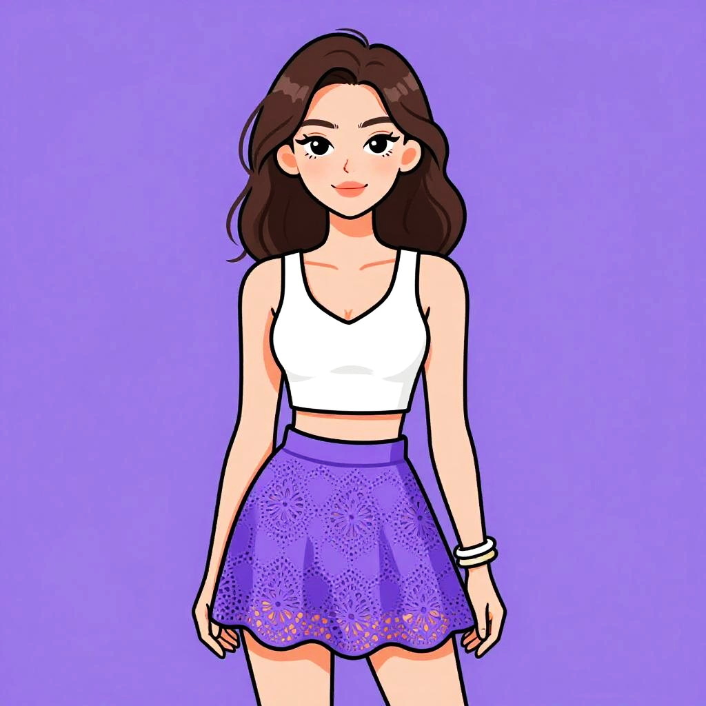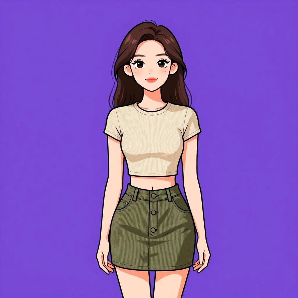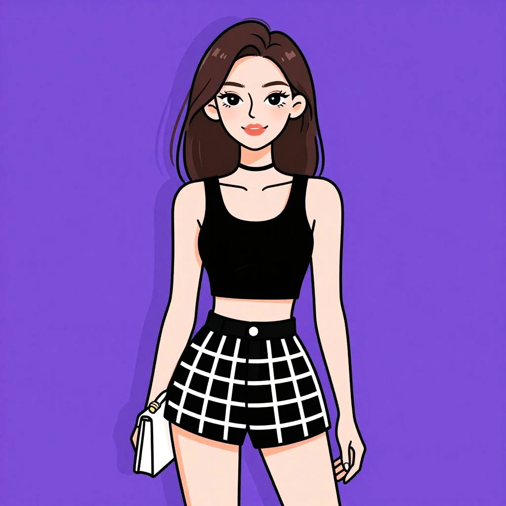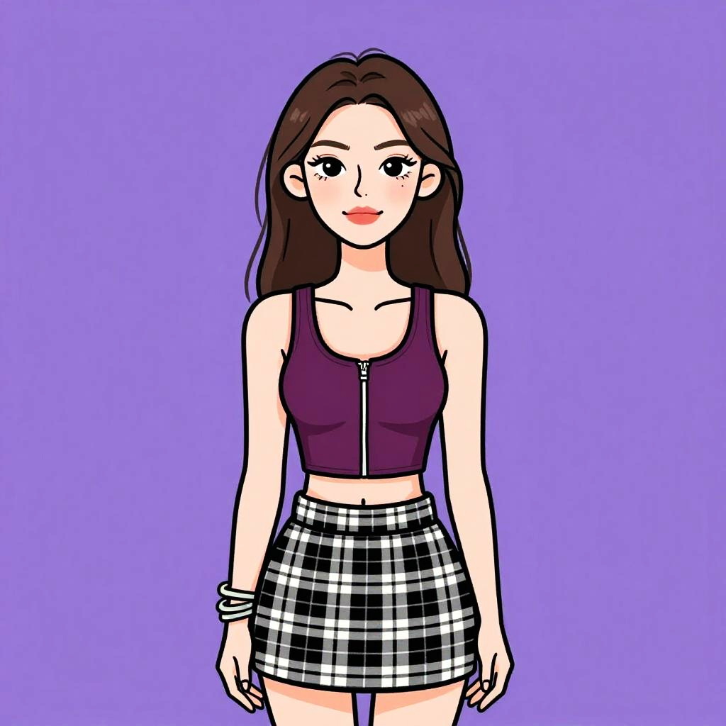 Woman with pretty face and pretty hair. Woman, casual, maroon cropped tank top with scoop neck and front zipper, plaid mini skirt in black and white with a high waistline, metallic bangles on one arm. --sref 1467