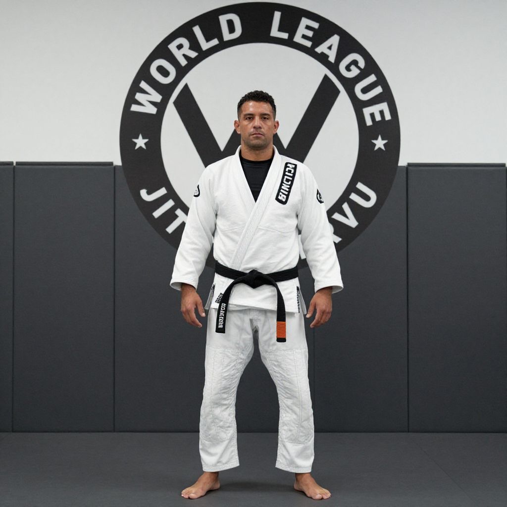 "World League Bjj, man in a white kimono standing in front of a wall"