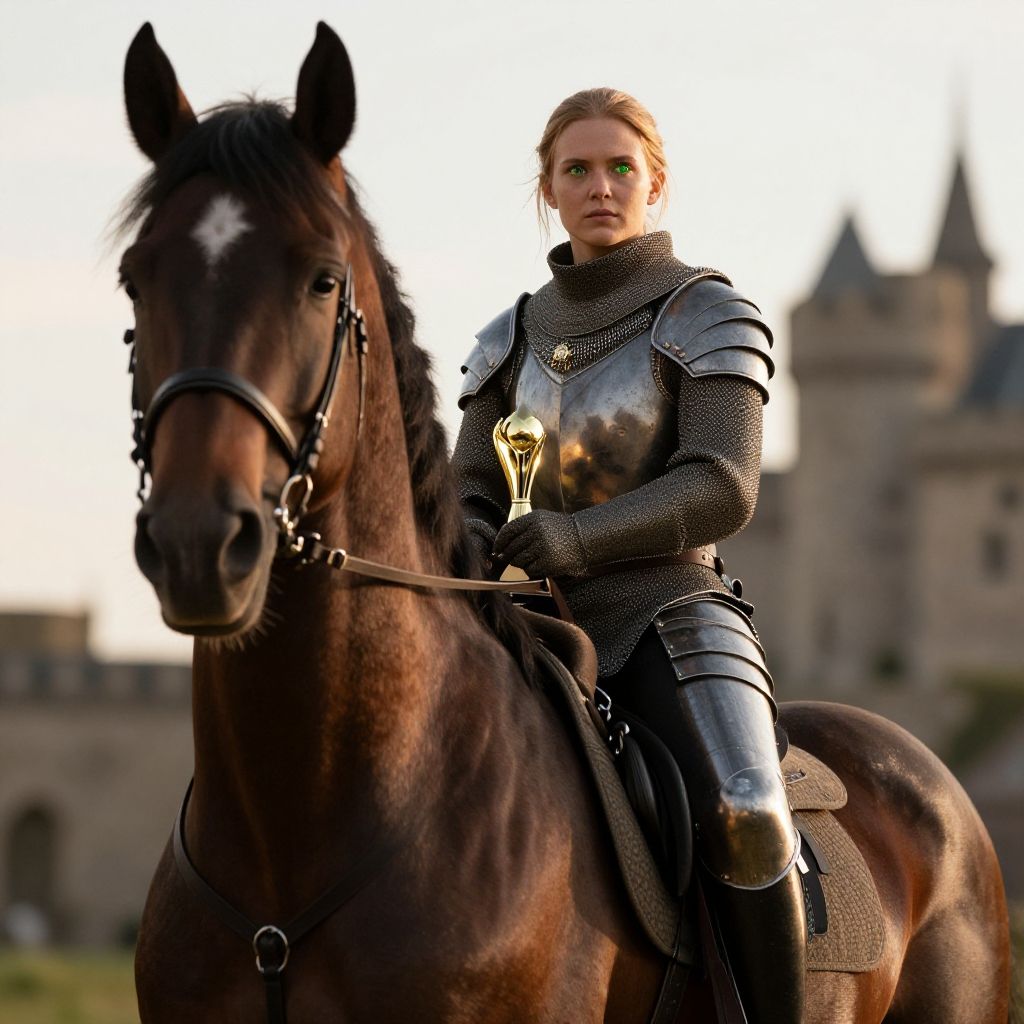 Photorealistic CGI of a determined blonde woman in shiny silver armor riding a dark brown horse in front of a blurred castle.