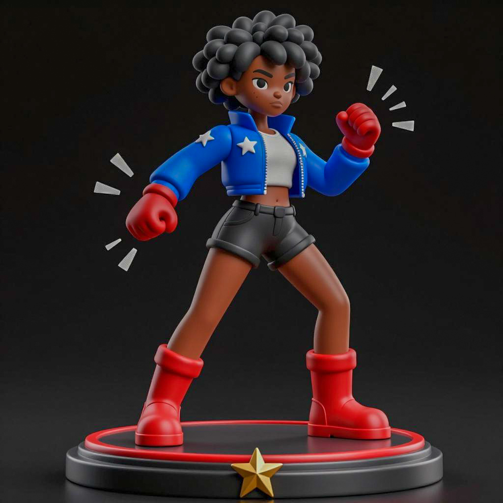 3D digital sculpture of a Black woman with curly hair styled in an afro, wearing a blue star-emblazoned jacket, white crop top, black shorts, red gloves, and red boots. She stands in a dynamic, action-ready pose on a black circular platform with red trim and a gold star. White shock effect lines appear around her gloved fists, emphasizing strength and intensity. The background is solid black, highlighting the vibrant colors and confident stance.