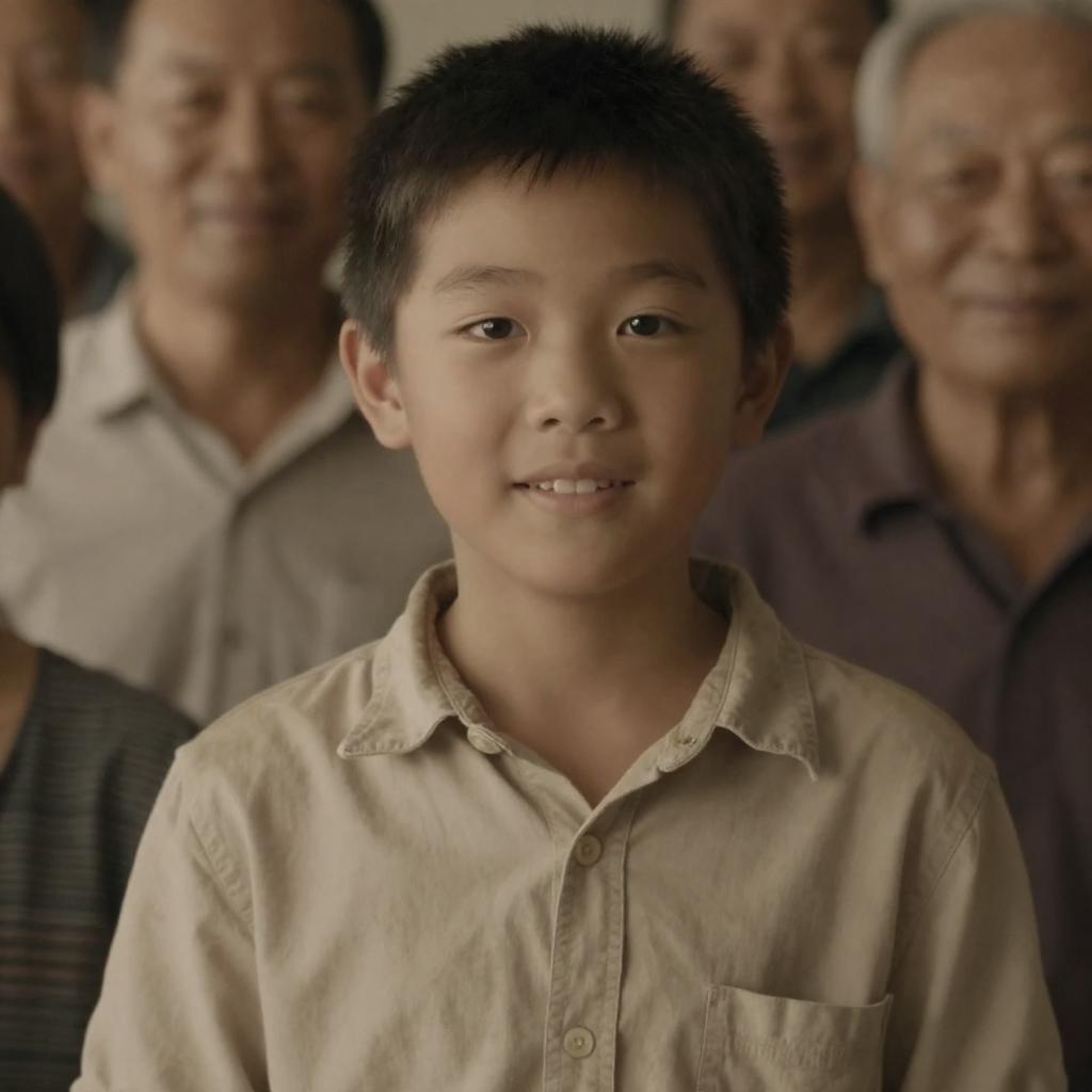 Photograph of a classroom. Central Asian boy with short black hair, blue polo with yellow trim, serious expression, standing. Surrounding children, mixed genders, smiling, relaxed. Background: colorful decorations, window with lattice, desks, teacher partially visible. Daylight.