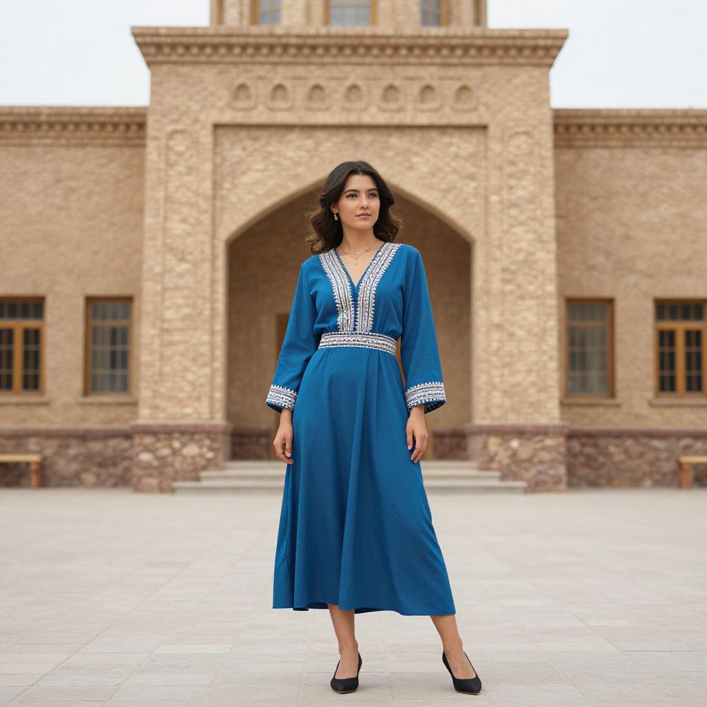 Central Asia Outfit, a woman in a blue dress standing in front of a building