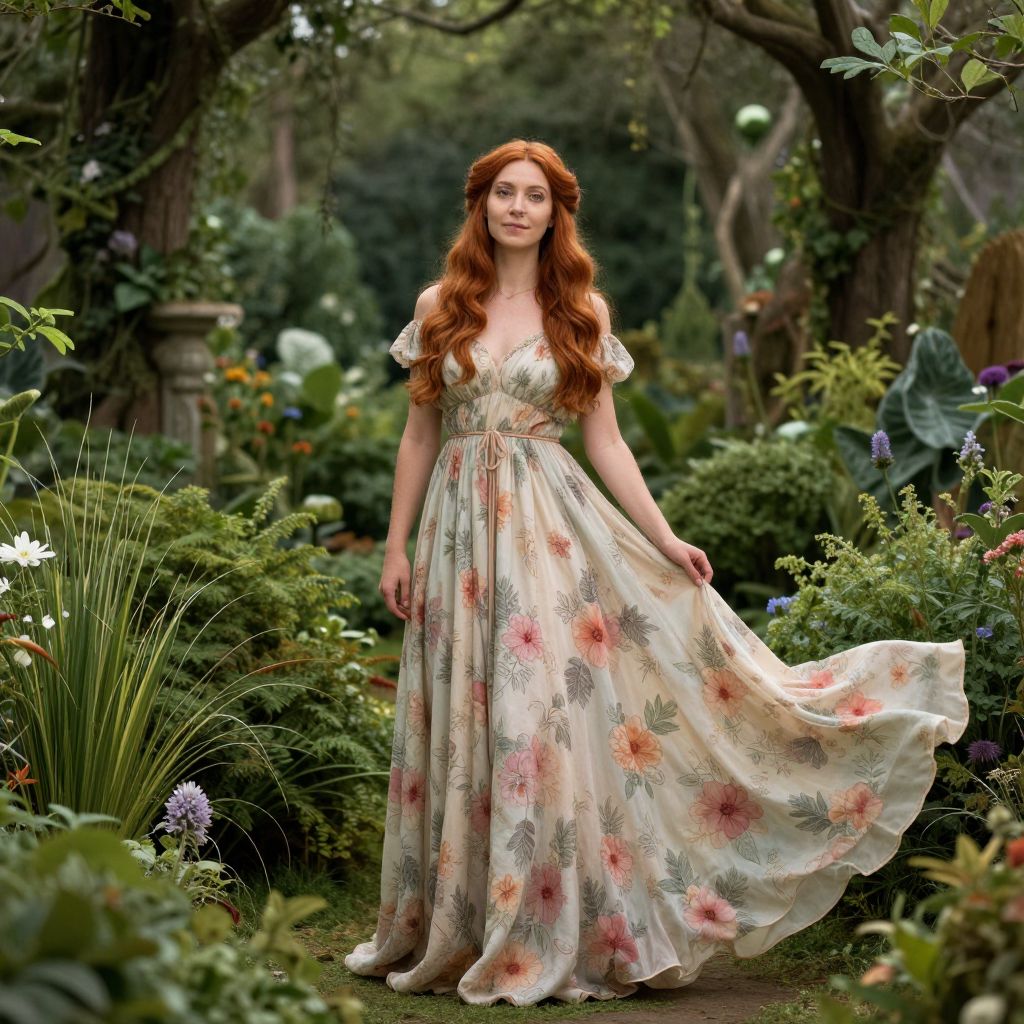 Photograph of a red-haired woman with long, wavy hair in a flowing, floral dress standing in a lush, enchanted garden.