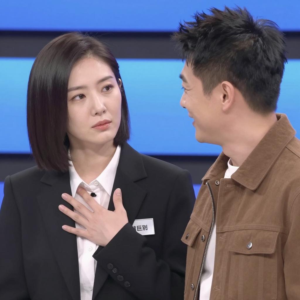 Photograph of two people. Woman with short black hair, wearing black blazer and white shirt, left side, looking slightly to the right, hand on chest. Man with short black hair, brown jacket, right side, smiling, facing woman. Background with blue and black horizontal lines. Woman's name tag visible. Both have light skin. Woman looks serious, man looks happy.