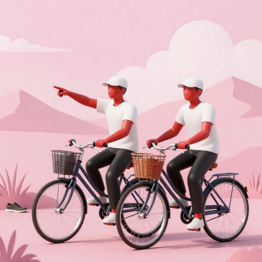 3D illustration of two red-skinned individuals riding bicycles side by side in a stylized pink landscape. Both wear white shirts, black pants, and white caps. The bicycle on the right has a wicker basket, while the other has a metal basket. The person on the left is pointing forward. The background features abstract pink mountains, clouds, grass elements, and a single discarded shoe on the ground.
