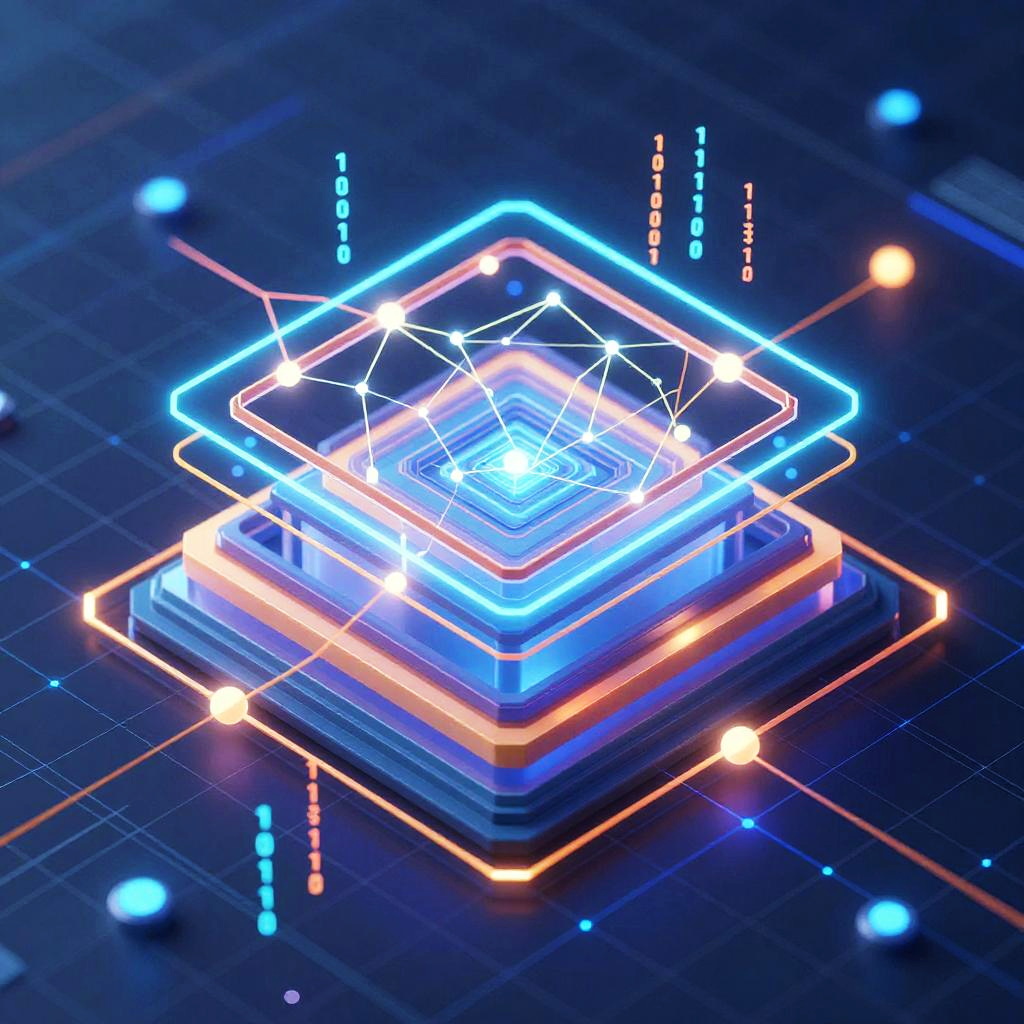 An abstract visualization of AI model training featuring layered geometric shapes, interconnected neural pathways, and streaming binary data, all embedded within a luminous grid matrix, using bright electric colors to emphasize information flow and computational power.
