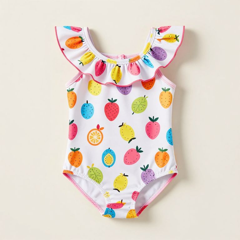Vibrant toddler girls' swimsuit featuring a playful fruit print and ruffled neckline, designed by FLJ CORPORATIONS, showcased against a neutral background.