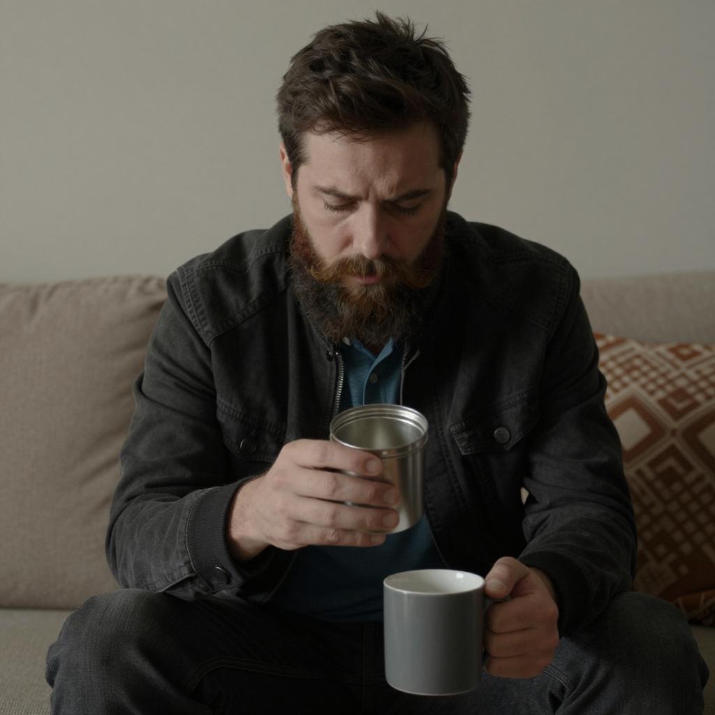 A close-up photograph of a white man with dark brown hair wearing a gray zip-up jacket. He is holding a small clear glass of water in his right hand and looking at it with a surprised and intense facial expression, mouth slightly open. The background is softly blurred with warm neutral tones.