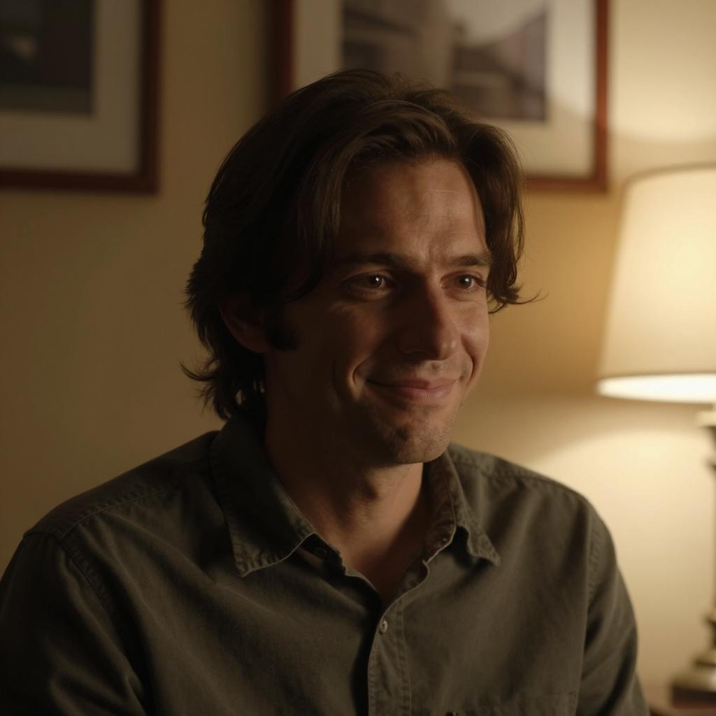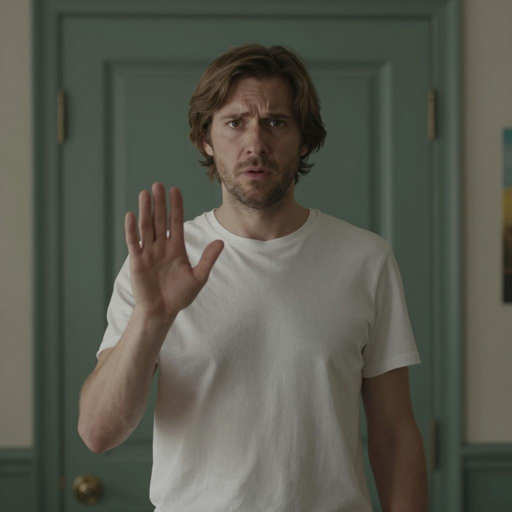 A photograph of a white man with dark brown hair, wearing a gray ured jacket, holding a small clear glass in his right hand, looking surprised with slightly parted lips. Background is blurred with warm colors. His facial expression is intense. One person.