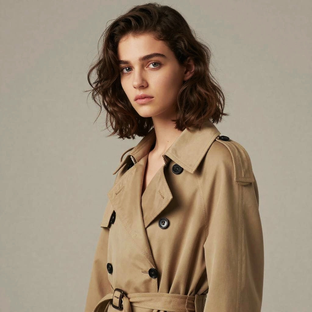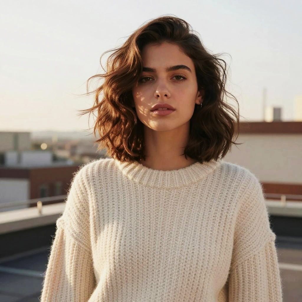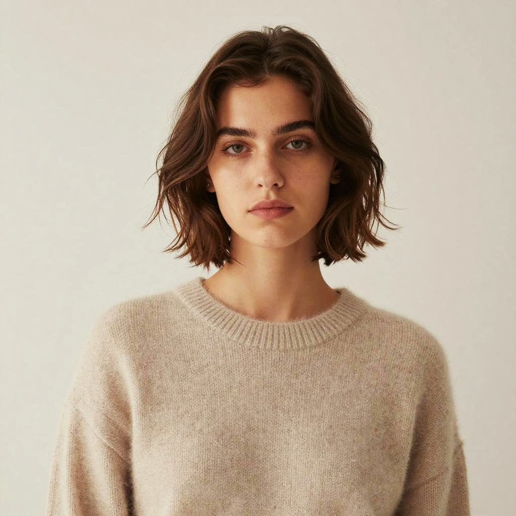 Wavy Crop hairstyle on female model, wearing cashmere sweater, in photo studio, captured in fashion editorial style with soft natural tone.