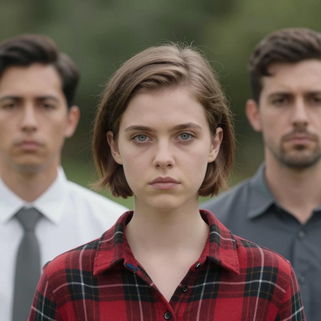 Photograph of a young blonde woman with light skin, wearing a white shirt, looking intently at a blurred figure with a dark, patterned background. Her hair is loose, and she has a serious expression. The blurred figure is partially visible, with a hand resting on their shoulder. Two people, intense facial expression on the woman.