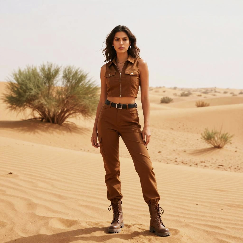 A confident young woman stands in a vast desert landscape, dressed in a stylish and functional brown outfit. The warm tones of the sand and the striking vegetation enhance her adventurous look, evoking themes of exploration and resilience.