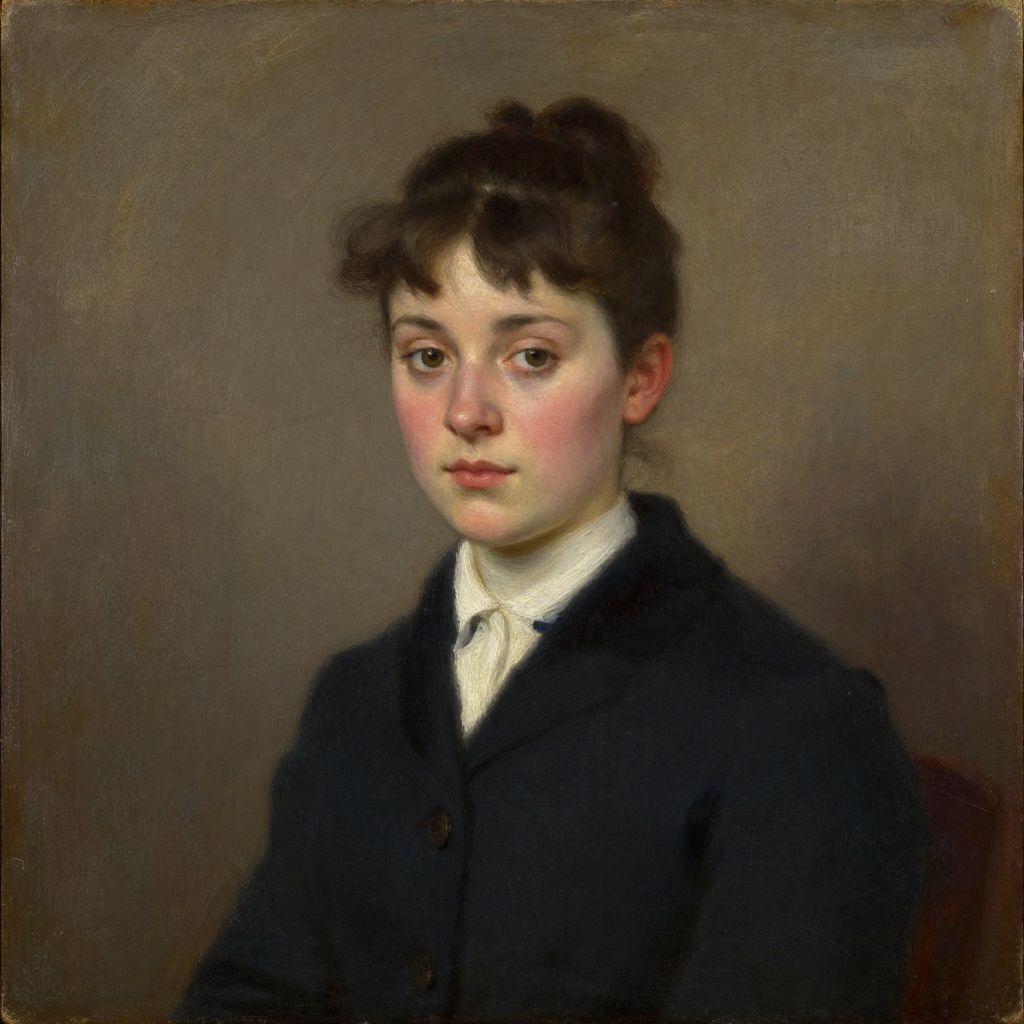 This is a digital painting in a realistic style depicting a young Caucasian boy with fair skin, dark brown curly hair, and large, expressive brown eyes. He has a slightly rosy complexion and a neutral expression. He is wearing a dark, almost black, overcoat over a white collared shirt with a subtle knot at the neck. The background is a plain, textured brown gradient, drawing focus to the boy. The brushstrokes are smooth, adding a gentle texture to the painting, and the overall color palette is muted, emphasizing the subject's serious demeanor.