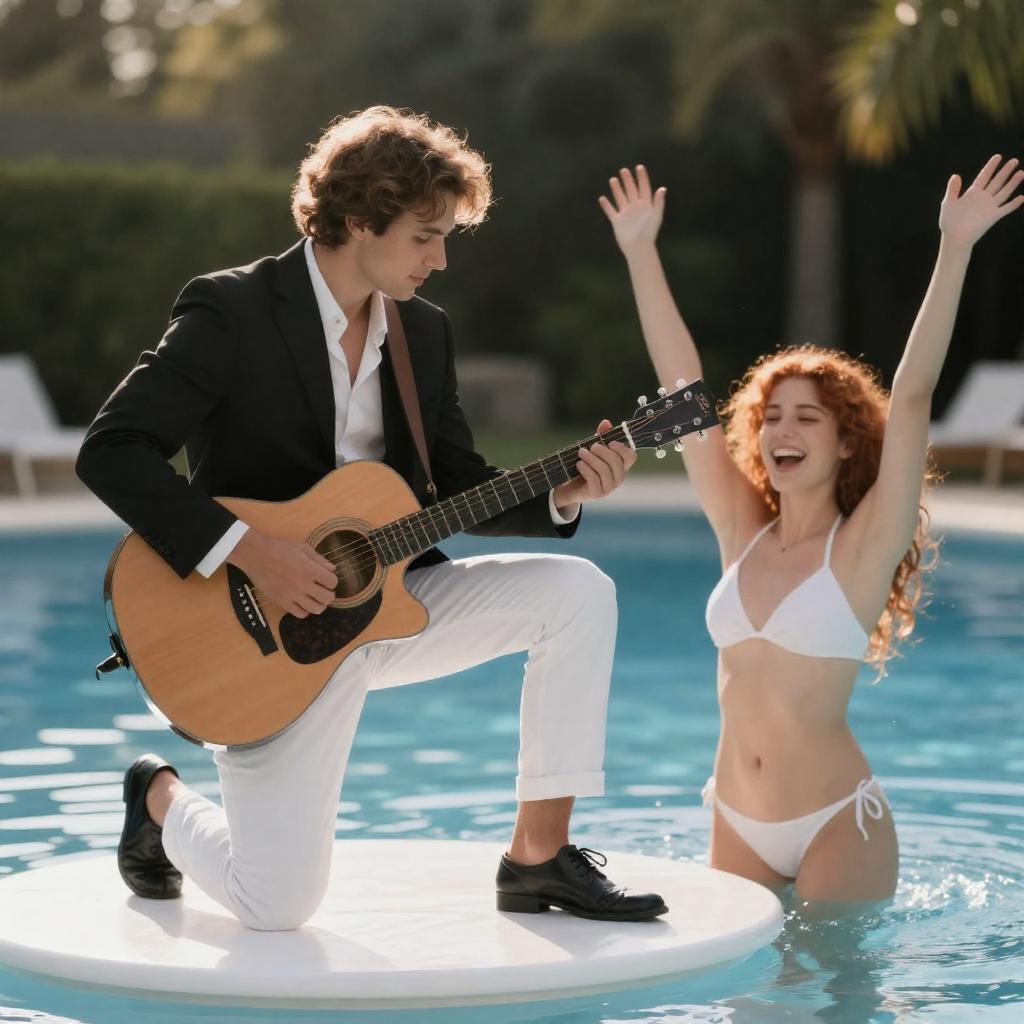 Photograph of a man in a black suit and white pants playing an acoustic guitar while kneeling on a glowing white platform. A smiling woman with red hair, wearing a white bikini, swims in the water beside him, raising her arms joyfully. Background features blurred trees and sunlight.