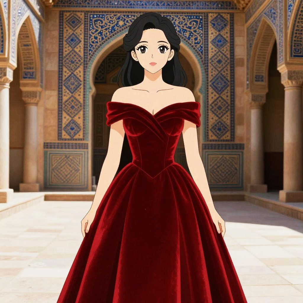 A woman, in a digital manga style, exuding classic elegance in a fitted off-the-shoulder red velvet gown with a full skirt, standing in an Ancient Persian Palace, surrounded by intricate mosaics and ornate architecture. Sexy. Pretty face and beutiful eyes