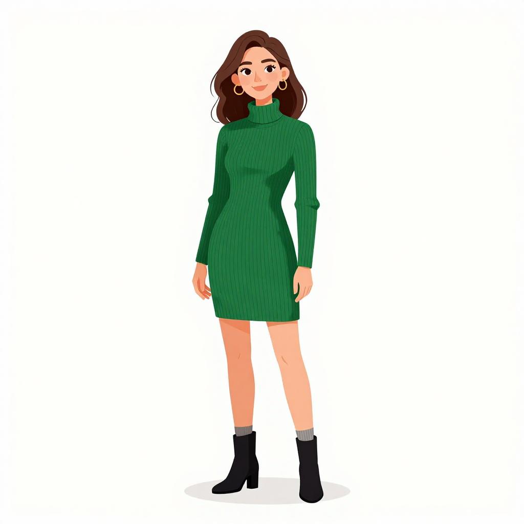 Digital illustration of a smiling woman with medium-length brown hair, wearing a green rib-knit turtleneck dress, black ankle boots, and gold hoop