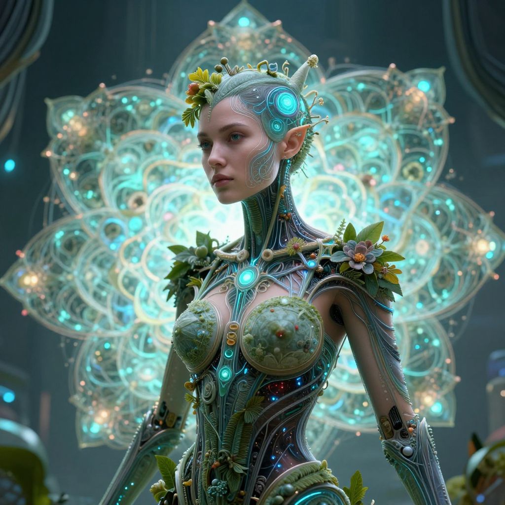 Cybernetic Woman with Botanical Neural Designs