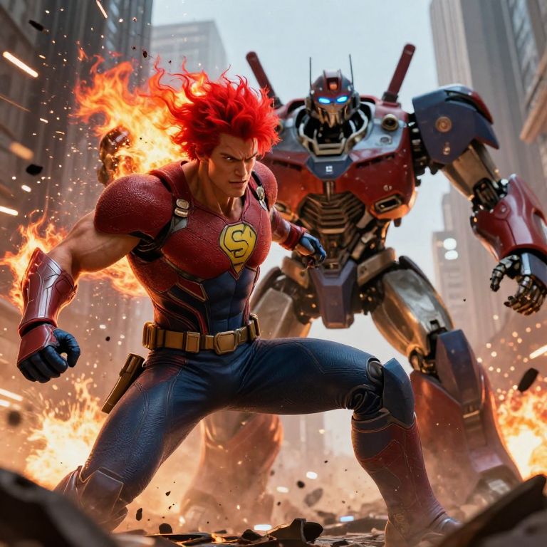 A dynamic, digital CGI image features a muscular, bearded man with dark curly hair and a fierce expression, wearing an ornate, red and gold armored outfit with a revealing chest. Behind him stands a towering, menacing robot with red eyes and metallic armor. The background is a futuristic, neon-lit cityscape with vibrant red and blue lights. The man's stance is powerful, fists clenched, ready for battle.
