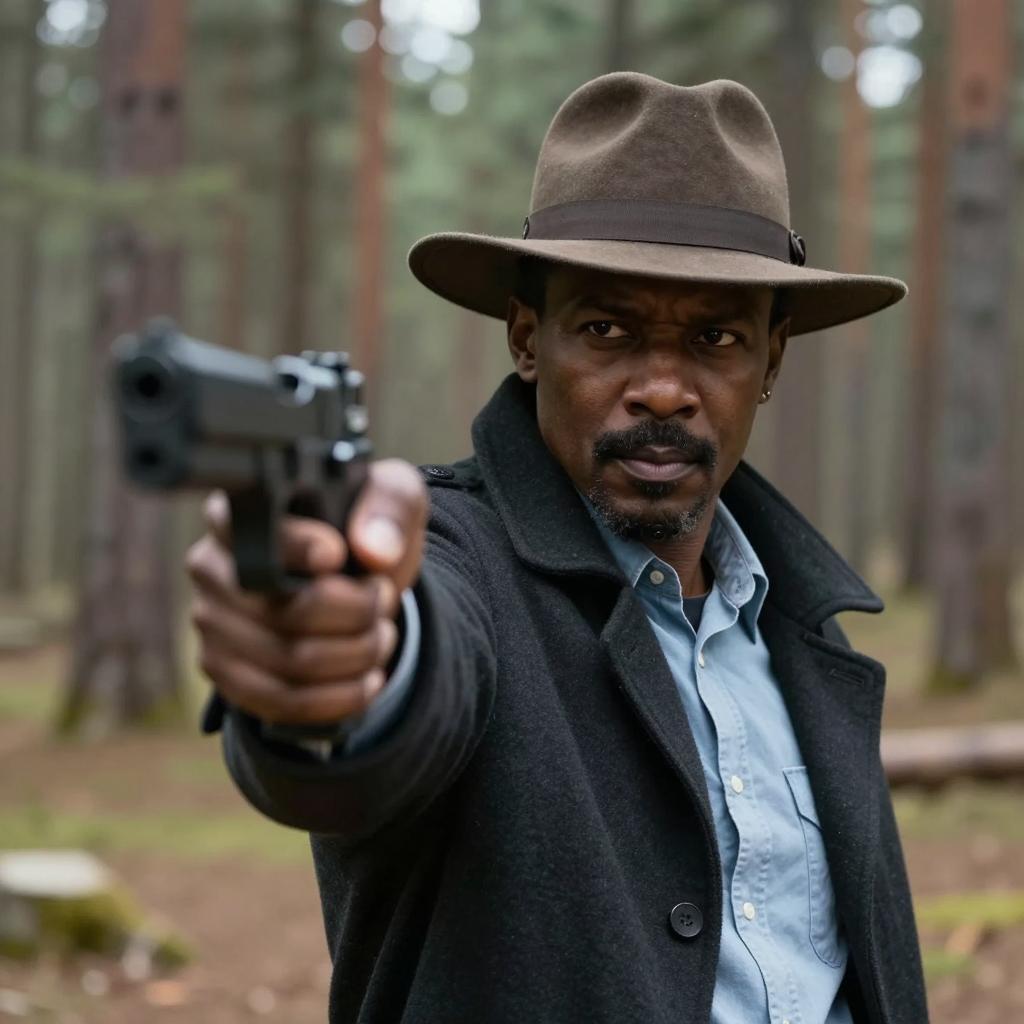 Two men standing back-to-back in front of a car. Both wear brown fedoras and dark sunglasses. The man on the left has light skin, short dark hair, a navy jacket, and a white shirt with "CHICAGO" . The man on the right has dark skin, a brown jacket, and a yellow shirt. Both have neutral expressions. The background shows a car with a glass window.