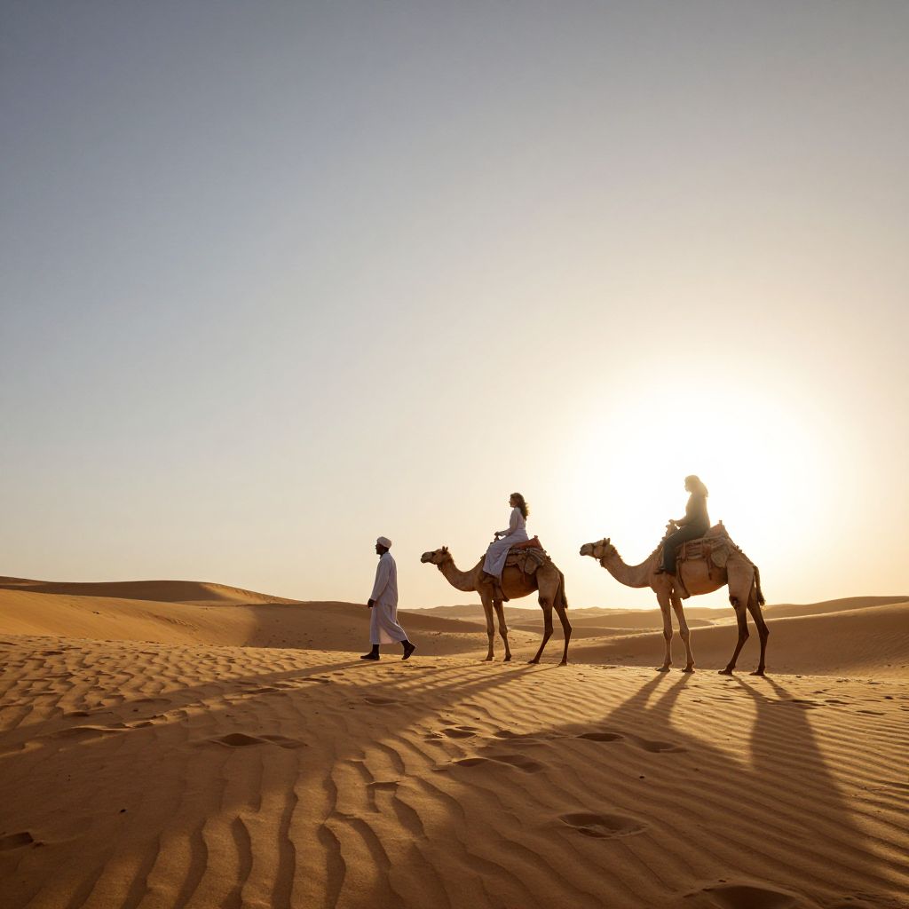 Books float gracefully above a desert landscape as two figures—a man walking and a woman riding a camel—journey through the golden sands, their silhouettes cast by the warm sunlight against the horizon.