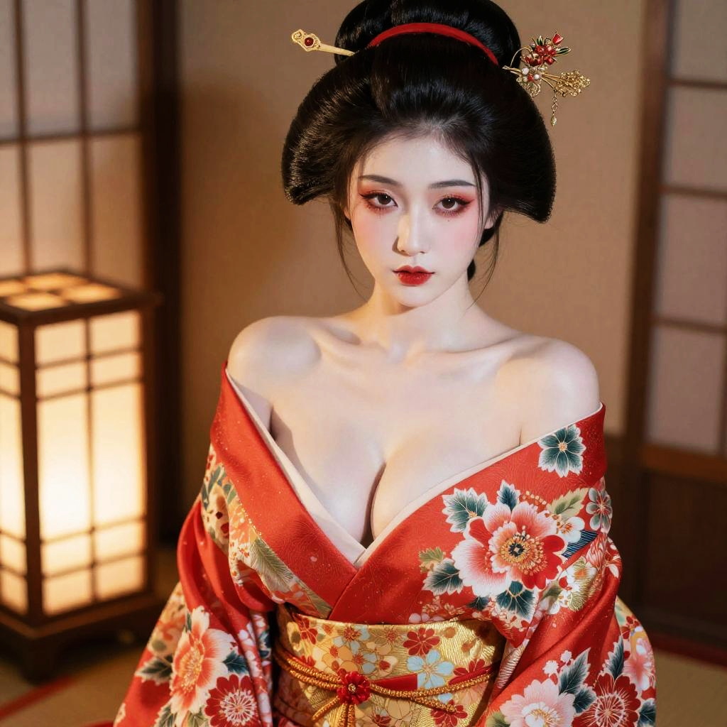 Exotic android geisha, extra large cleavage, petite frame, porcelain skin, vibrant floral kimono.