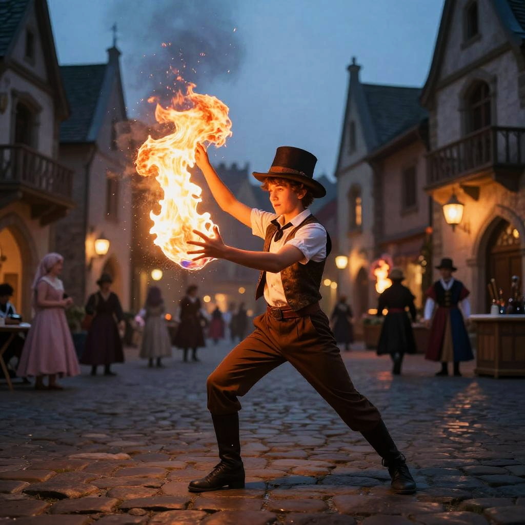 Magico, a vibrant scene of a young magician apprentice practicing glowing fire magic in a medieval town square at dusk, sparks and magical flames illuminating the cobblestone streets, dynamic pose, fantastical realism style with rich textures.