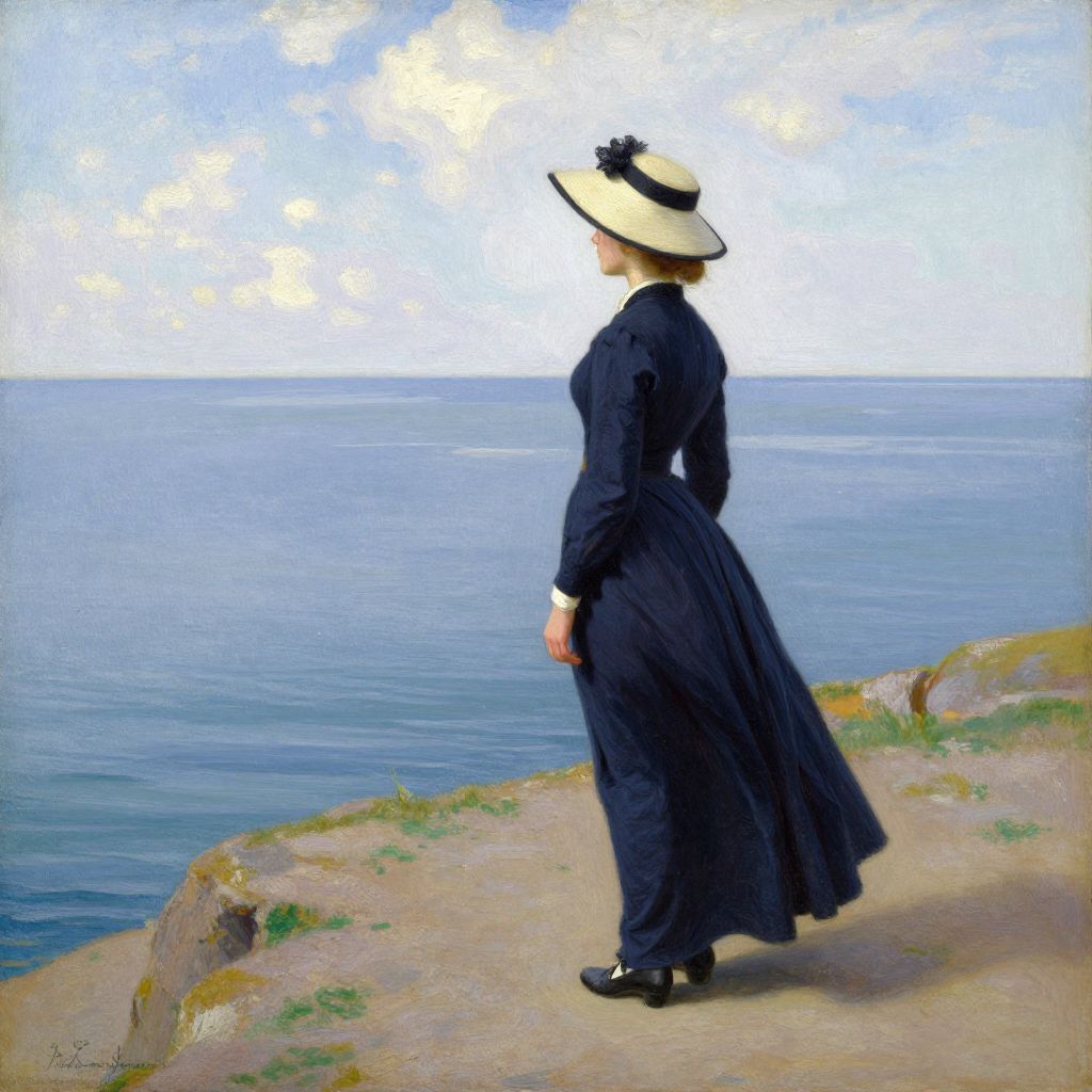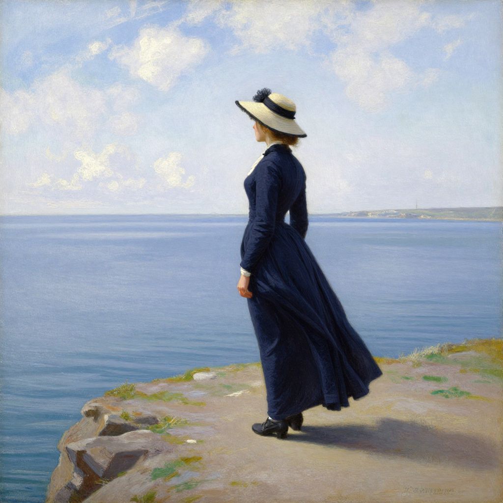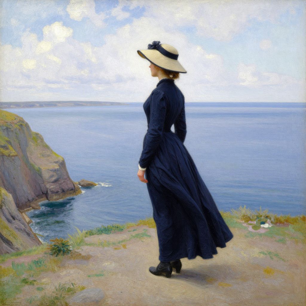 This is a digital painting in a realistic style depicting a woman standing on a cliff overlooking a vast blue ocean. She is dressed in a long, dark navy blue Victorian-style dress with a high collar and full skirt, paired with black shoes. She wears a wide-brimmed beige hat with a black ribbon. Her profile is shown in profile view, facing the sea. The cliff has a rocky texture with green grass patches. The sky is bright with scattered clouds. The ocean stretches to the horizon, creating a serene and peaceful atmosphere.