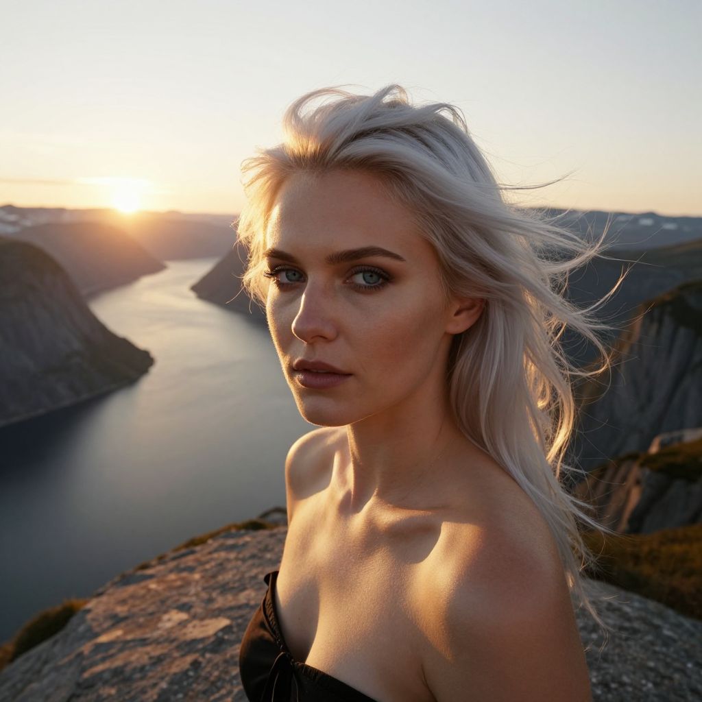 A photorealistic portrait of a Slavic woman with mesmerizing ice-blue eyes and flowing platinum hair sits atop a rocky cliff at sunset. The warm golden light of the setting sun illuminates her fair skin, casting dramatic shadows across her striking features. From an aerial perspective, we capture her introspective gaze as she reflects on the serene fjord below, evoking a sense of awe and solitude.