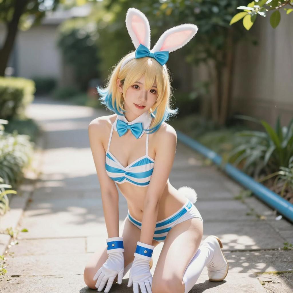 Photograph of a blonde woman in a sunny garden, wearing a blue and white striped bikini top, white shorts with blue trim, white sneakers, and a blue and white headband with bunny ears. She stands on a stone path, leaning forward with hands raised, surrounded by greenery and a wooden gate in the background.