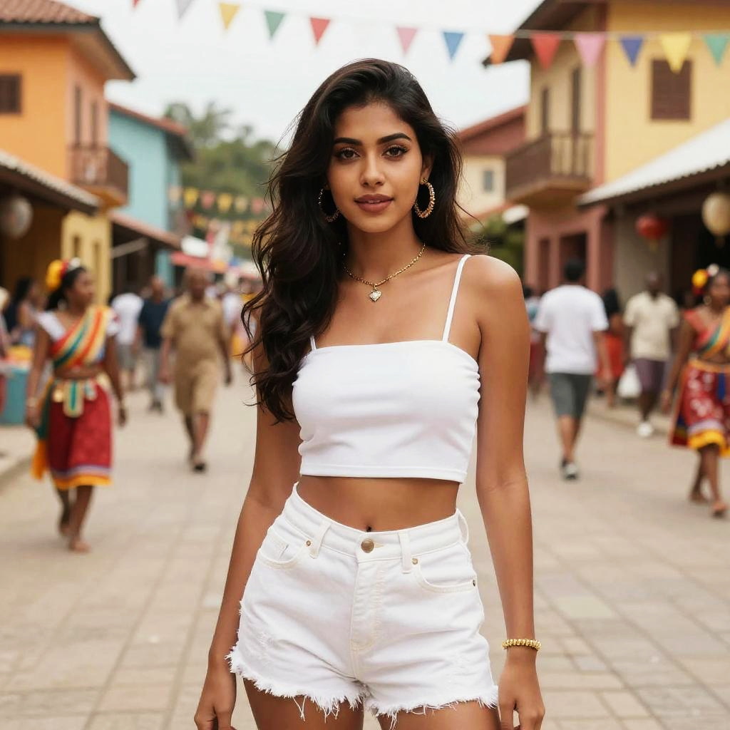 A busty woman in a bohemian chic sleeveless cream blouse with lace details and slim-fit black trousers, captured in a vibrant cultural celebration at a coastal town carnival, showcasing a lively and colorful atmosphere. Sexy. Pretty face and beutiful eyes