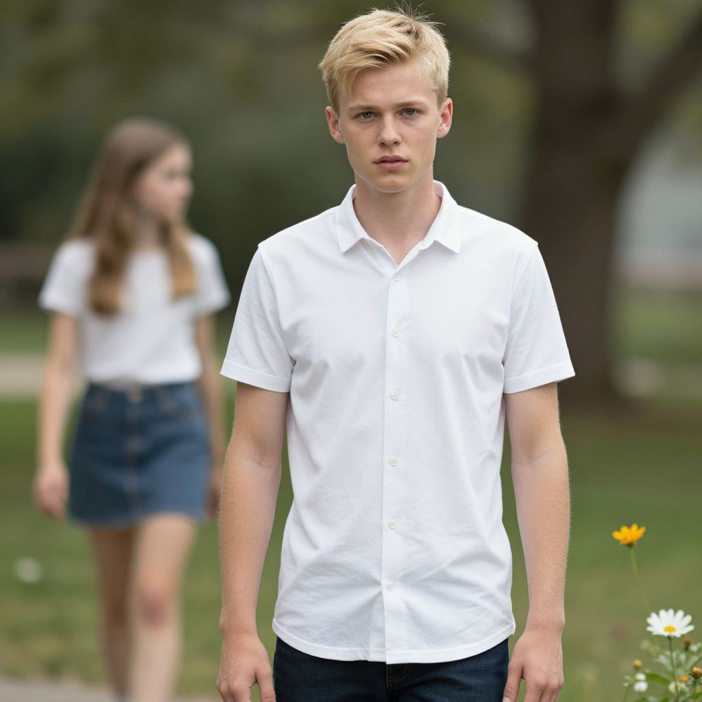 Photograph of a blonde teenage boy in a white shirt standing in a blurred park background, with a blurred brown-haired girl in a white shirt and denim
