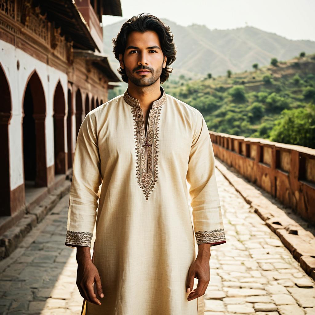 Kurta style, photorealistic portrait of handsome man, standing in narrow street, wearing traditional beige kurta with brown embroidery, medium skin tone, dark wavy hair, light stubble, serious expression, sunlight casting soft shadows, ancient buildings in background, green hills in distance, warm and natural colors, daytime, slight blur in background, casual pose, detailed ures, ethnic attire