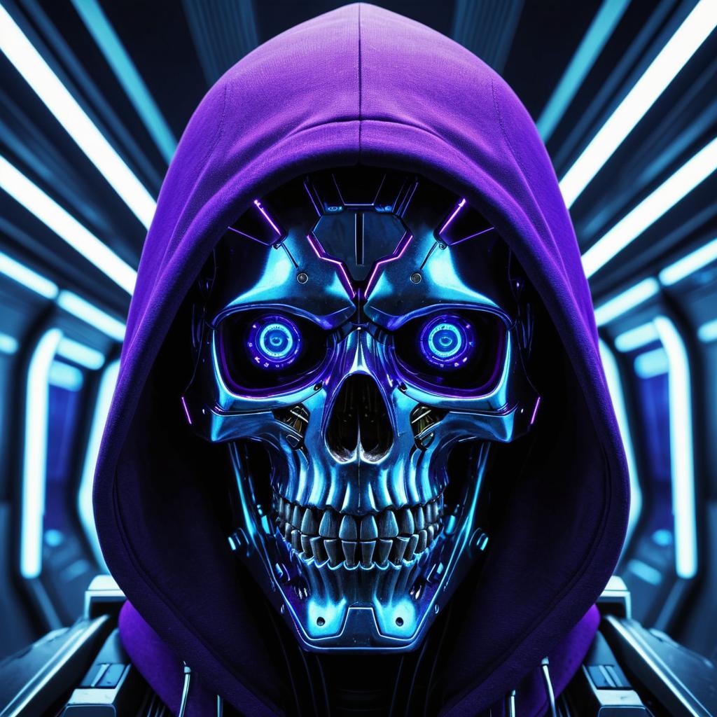 Front-facing portrait of a purple hooded robotic skull with chrome accents, electric blue neon eyes, neon-lit futuristic metro background. Hyper-realistic, smooth shading, futuristic with smooth shading, 8K resolution, cyberpunk cinematic color grading, post-processed in Unreal Engine