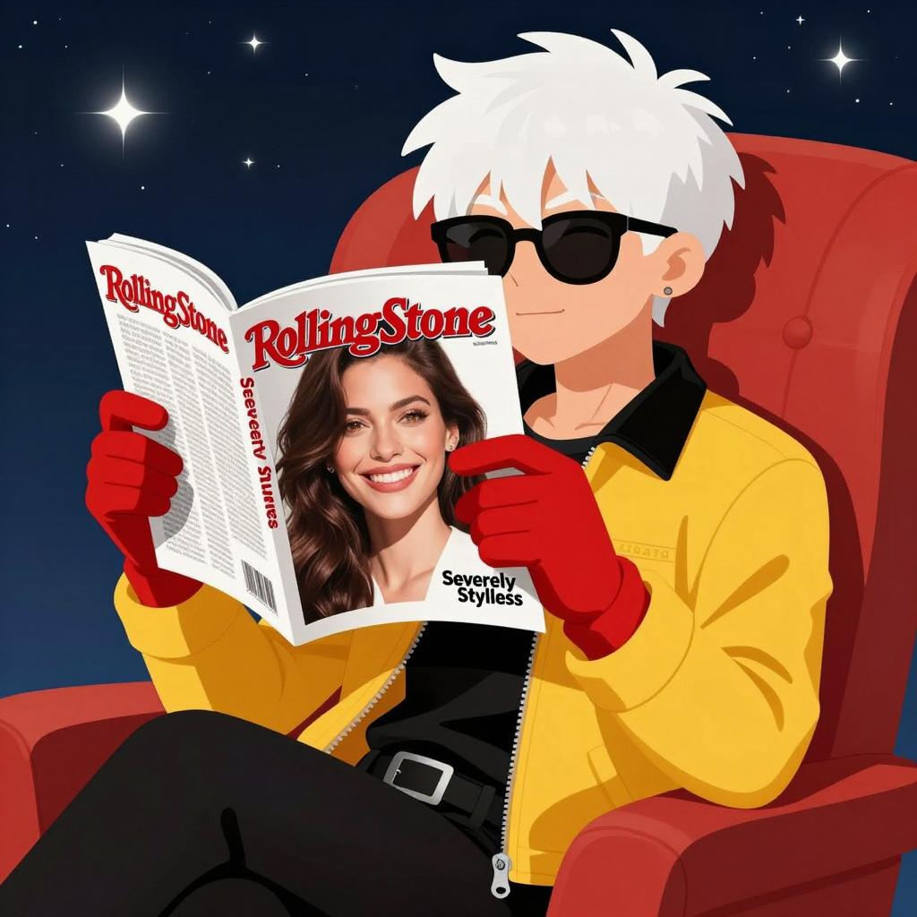 Illustration of a white-haired character with sunglasses, sitting in a red armchair in a starry background. Character holds a magazine with a smiling woman's face and "Rolling Stone: Severely Stylless." Character's red-gloved hands grip the magazine. Character wears a yellow jacket with a black collar. Magazine title is prominent in red letters. Starry background with blue and white stars. Character's face partially obscured by magazine.