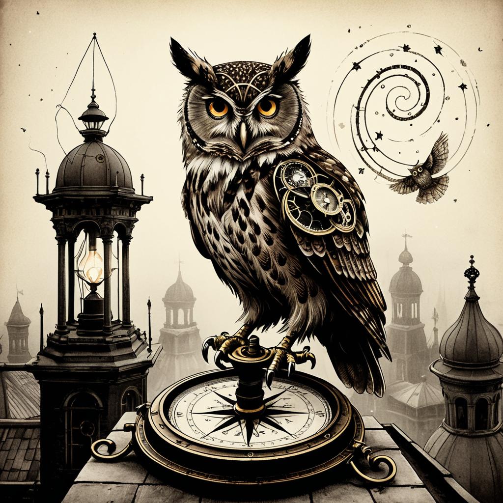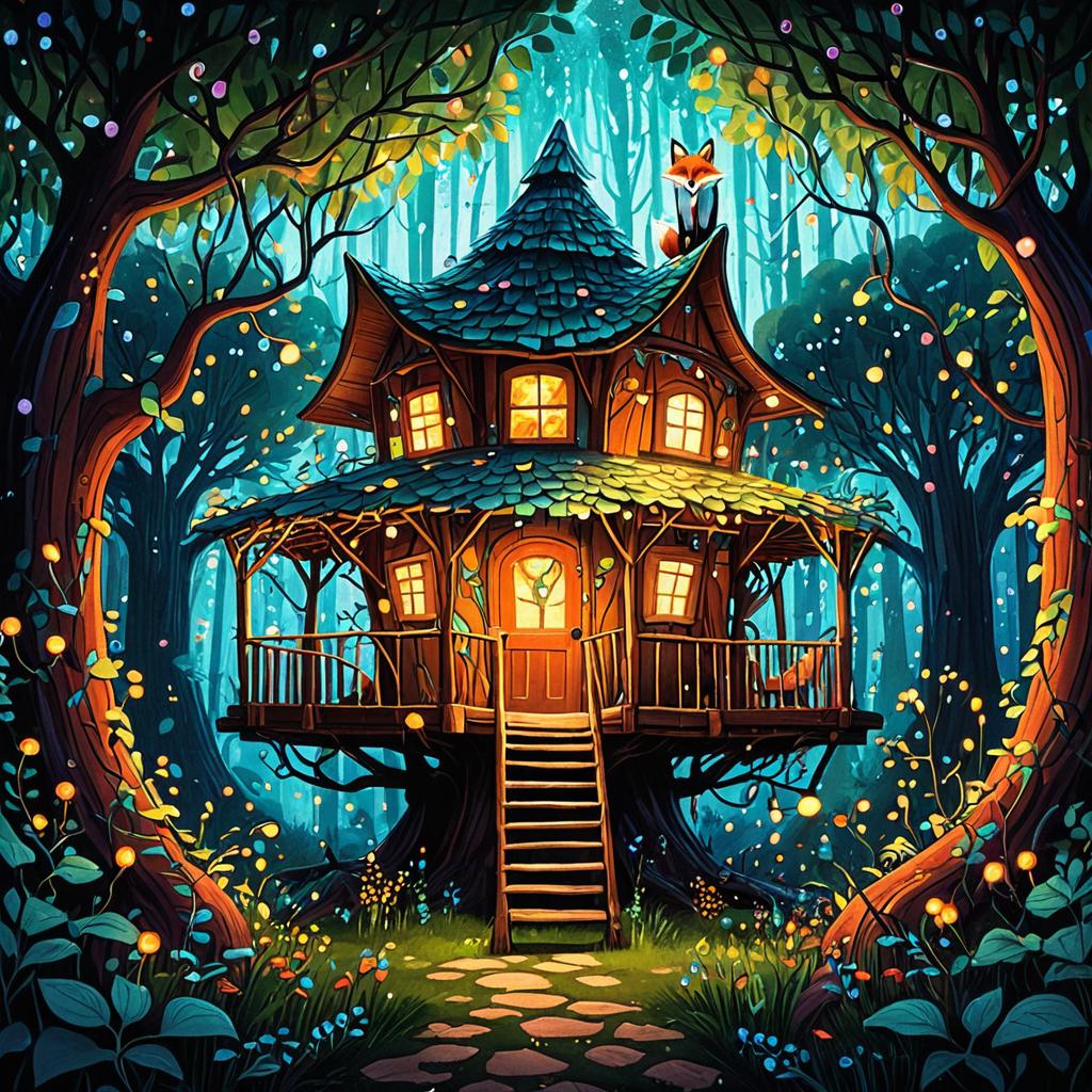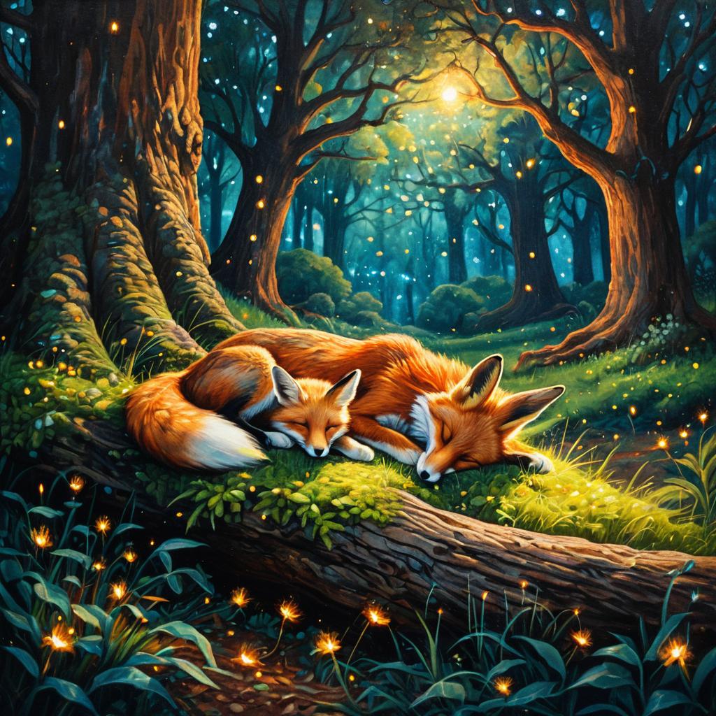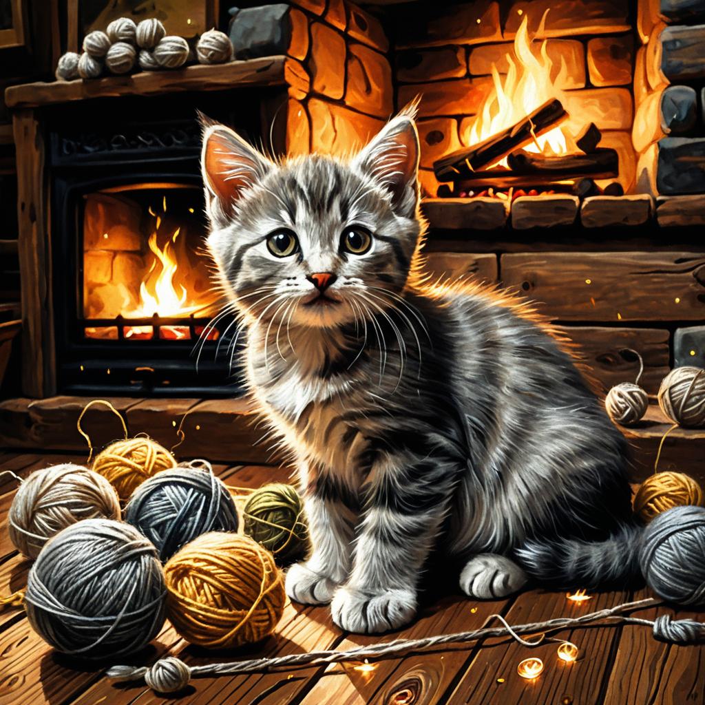 Playful grey kitten tangled in yarn balls in a cozy rustic living room with a crackling fireplace, rendered in detailed oil painting with rich textures and warm lighting with glowing fireflies and a gentle warm color palette.